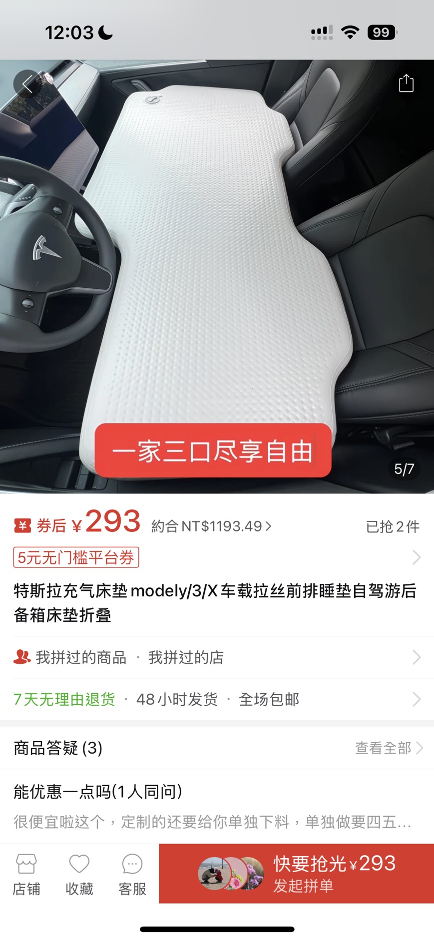 商品名稱 :特斯拉 前排睡墊充氣床墊